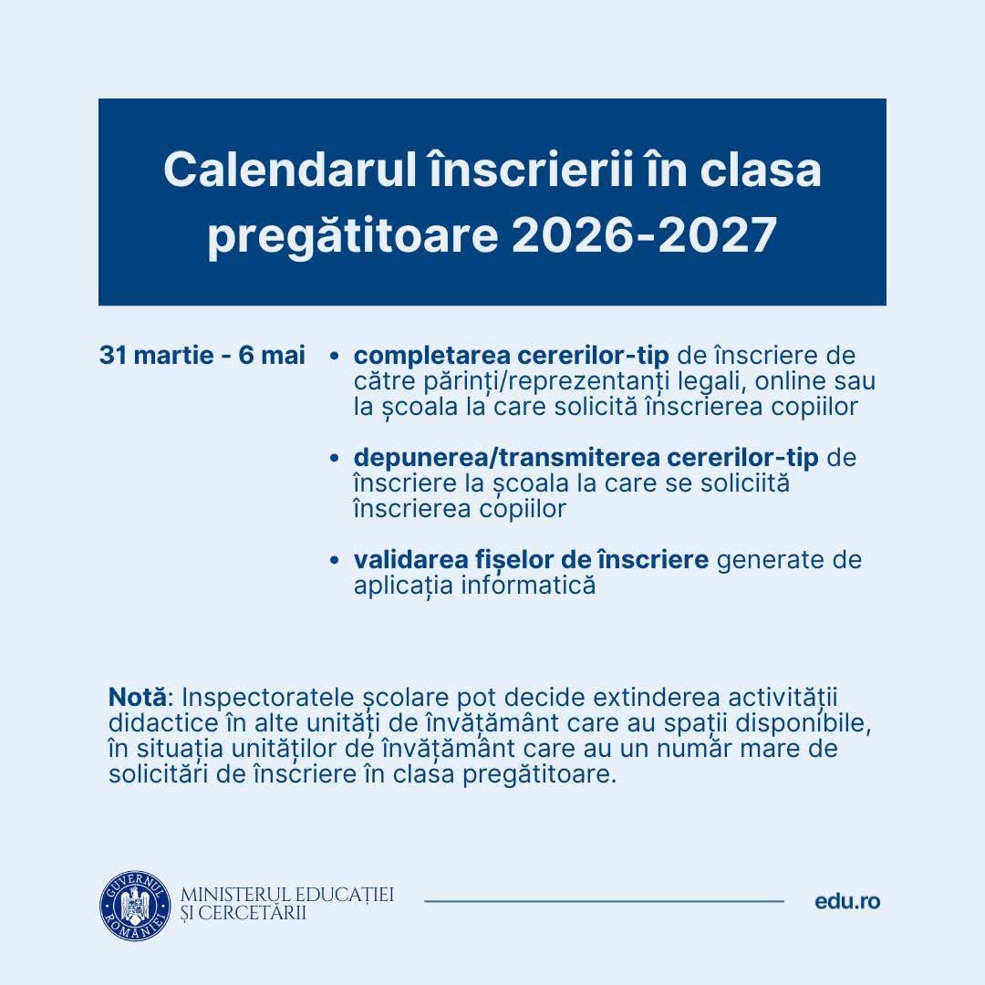 În 12 martie fiecare unitate de învățământ va comunica pe canalele proprii circumscripțiile școlare, precum și numărul de clase pregătitoare pentru anul școlar 2026-2027.