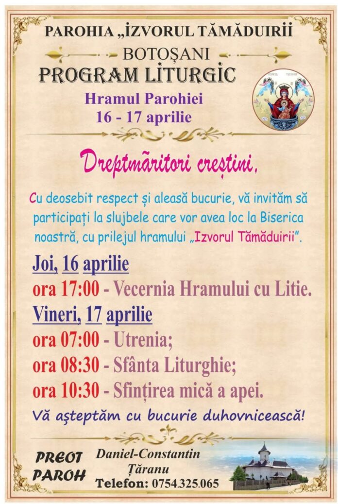 AnunțuriLocal În Vinerea Luminată – hram la Biserica Izvorul Tămăduirii din municipiu aprilie 16, 2026 În Vinerea Luminată👉hram la Biserica Izvorul Tămăduirii din municipiu 👇 Slujbele încep de astăzi, de la orele 17.00 Vezi mai jos programul complet.